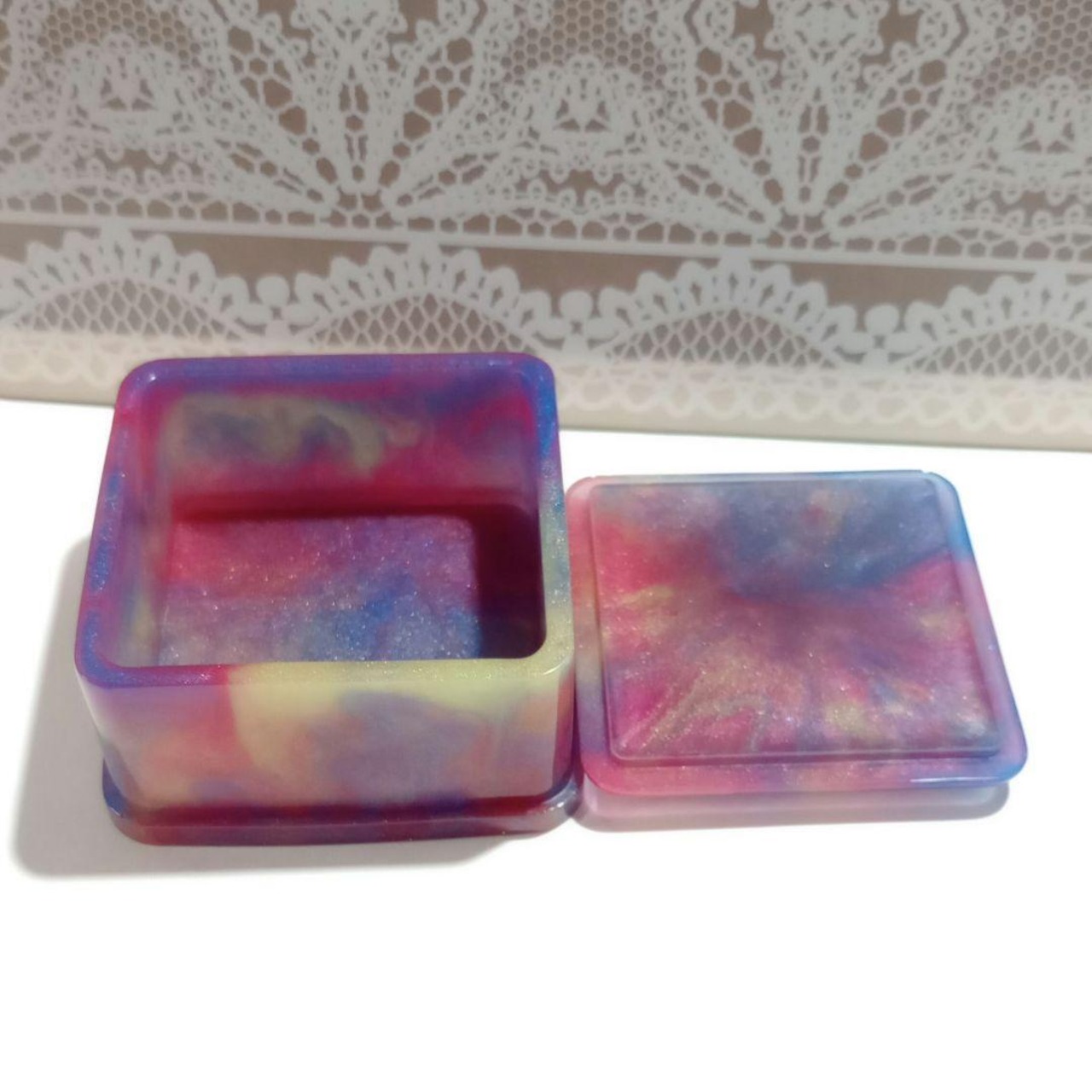 2液性レジンで丁寧に仕上げたフタ付き小物入れです。美しいマーブル模様が魅力で、アクセサリーや大切な小物の収納に最適なアイテムです。このケースはシンプルながらもスタイリッシュなデザインで、デスクやリビング、玄関など、どんなインテリアにも美しく調和します。毎日の生活を彩る、心弾むアイテムです!
